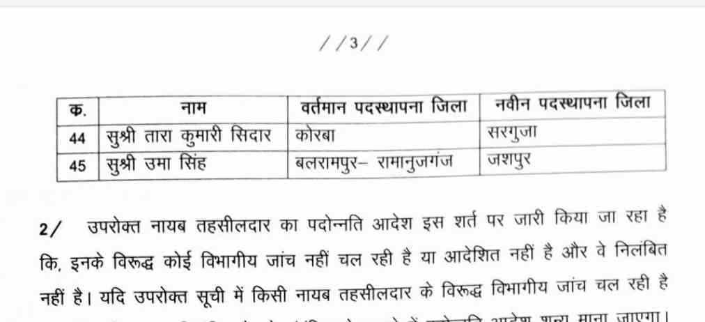 रायपुर। प्रदेश की सरकार ने 45 नायब तहसीलदारों को तहसीलदार के पद पर पदोन्नति दी है। पदोन्नत तहसीलदारों का स्थानांतरण भी किया गया है ।